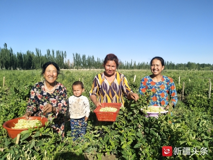 岳普湖縣擁有5000畝金銀花,已將它打造為支柱產(chǎn)業(yè)。僅岳普湖縣“三果一花”高效農(nóng)業(yè)示范園就種了1350畝,已經(jīng)全部開出花蕾,田間地頭都是忙著摘花的村民。