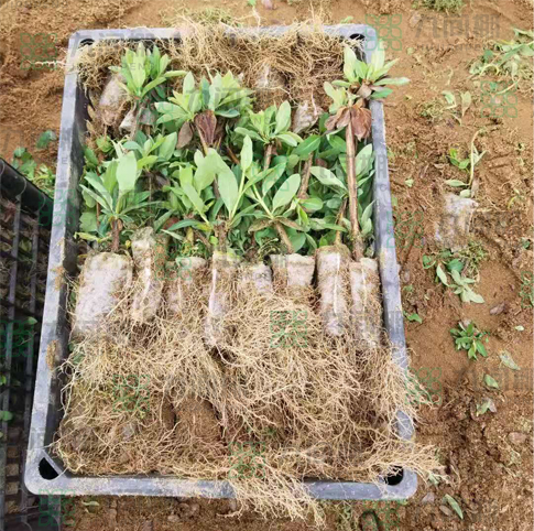 圖五 九間棚集團(tuán)金銀花營(yíng)養(yǎng)缽苗根系發(fā)達(dá)生長(zhǎng)健壯(王光東/拍攝)