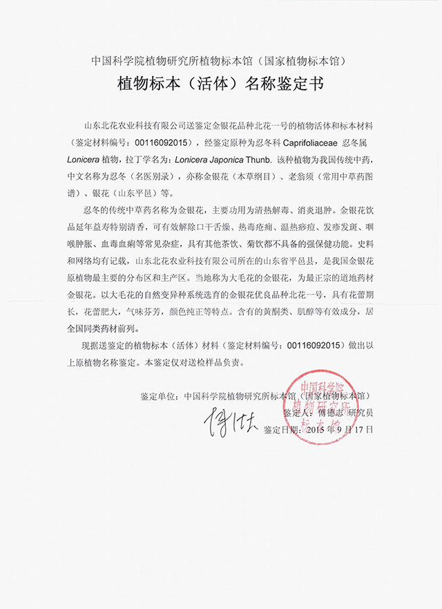 “北花一號”金銀花植物標(biāo)本(活體)鑒定書