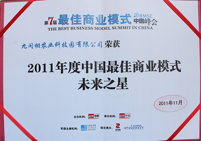2011年11月,九間棚農(nóng)業(yè)科技園有限公司被評為2011年度中國最佳商業(yè)模式未來之星