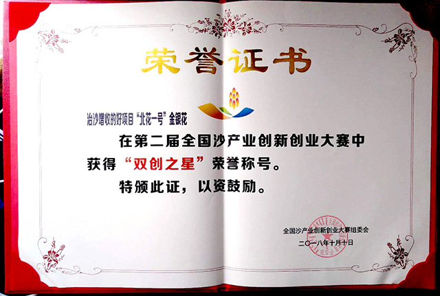2018年10月,“北花一號(hào)”在第二屆全國(guó)沙產(chǎn)業(yè)創(chuàng)新創(chuàng)業(yè)大賽中獲得“雙創(chuàng)之星”榮譽(yù)稱號(hào)。