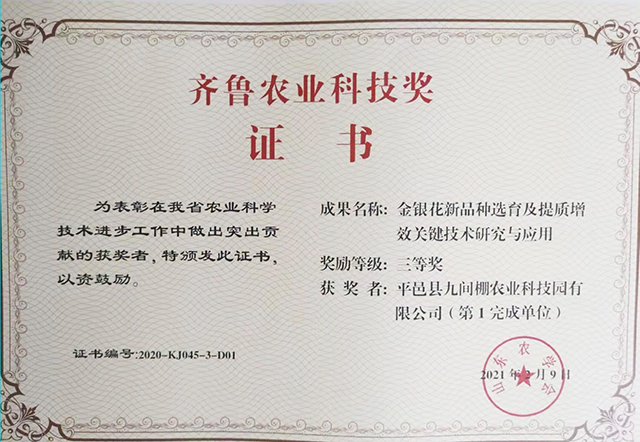 2021年2月,平邑縣九間棚農(nóng)業(yè)科技園有限公司在金銀花新品種選育及提質(zhì)增效關(guān)鍵技術(shù)研究與應(yīng)用中榮獲三等獎。